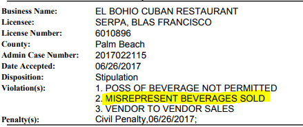 Florida Alcoholic Beverages and Tobacco Division on June 26, 2017 imposed a CIVIL PENALTY on El Bohio Cuban Restaurant in Lantana, Florida for alcohol violations. The most egregious charge was MISREPRESENTING BEVERAGES SOLD. According to the Florida Alcoholic Beverages and Tobacco Divisions report El Bohio Cuban Restaurant had two additional liquor violations VENDOR TO VENDOR SALES and POSSESSION OF BEVERAGE NOT PERMITED.